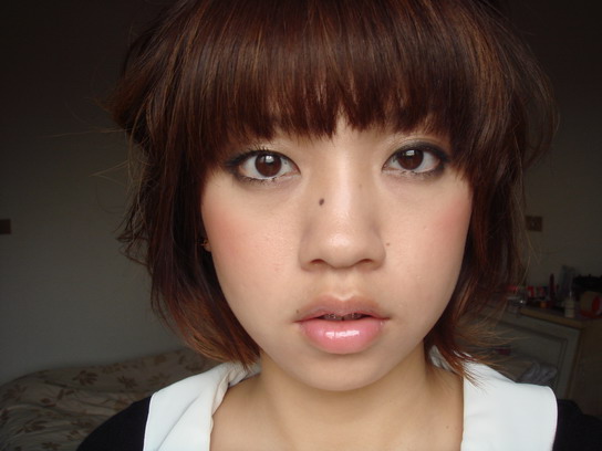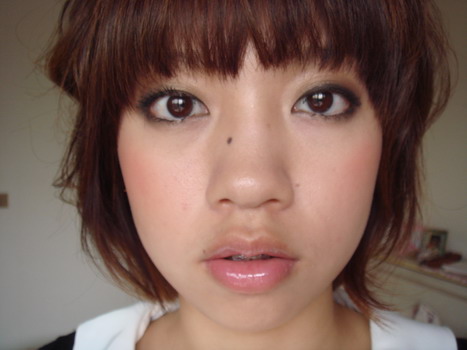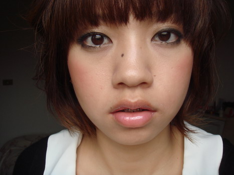 5. 刷上紅色腮紅 & 塗上半透明粉紅色唇蜜