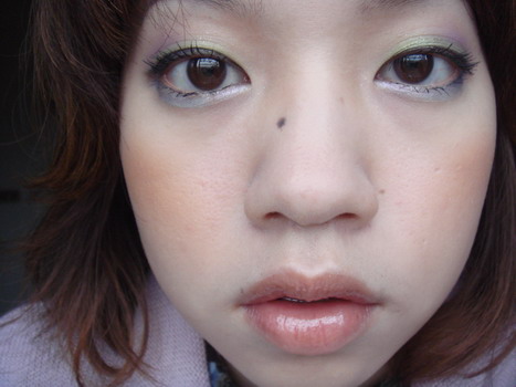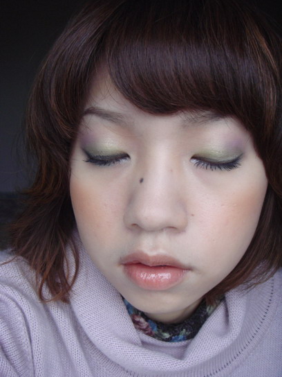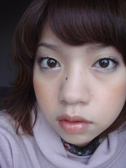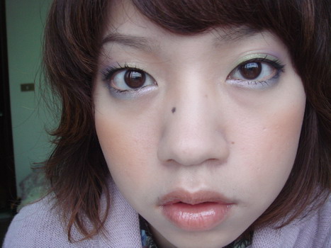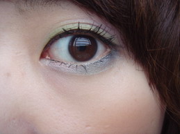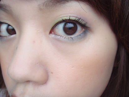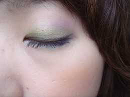 1. 綠色眼影畫稍粗上眼線 再刷上草綠色眼影在1/2眼窩處