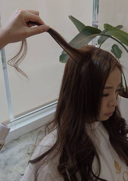 稍微靠頭皮近一點 但小心不要燙到唷
